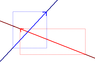 実際、パソコンのゲームでそういうのは見たことがないですしね。そういうわけで、イメージから入ってみます。 ![]() えーと、青と赤、点線で囲まれたふたつの線分がありますね。直線ではなく線分として考えてください。理由は後ほど。 さて、このふたつの明らかに交わっていますね。それでは、ちょっと数学っぽくいってみます。
