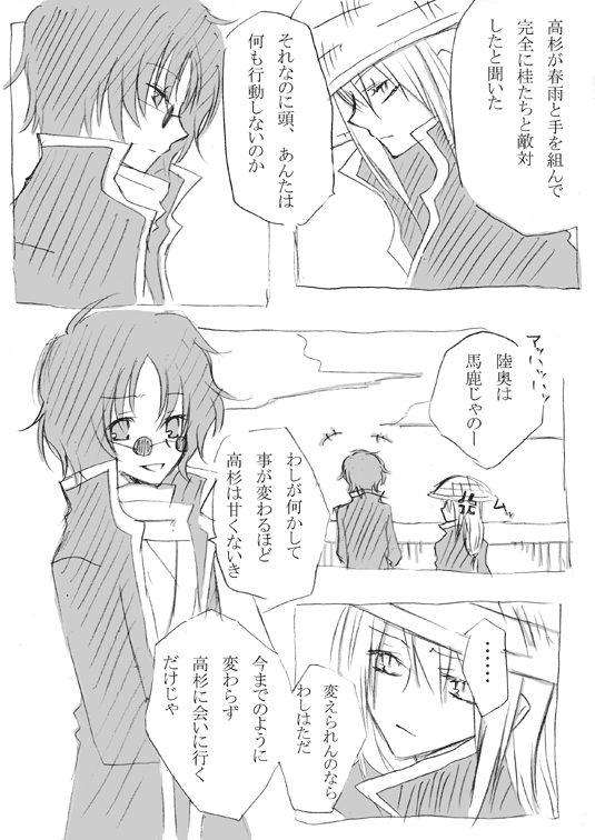 アニメ銀魂の紅桜を見たあとに、勢いで描いたもの。 高杉とヅラと銀さんの関係が変わってしまっても 高杉と辰馬の関係は変わってほしくないなという願望を込めて。(えー) 絡んでるわけでもないので、注意書きなしていってみました。