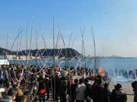 正月明けの行事の一つどんど焼きが近所の浜で行われた。今年、我が家が持っていた物は、長男の習字とお守り。家族全員の起床が遅かったため、食事を終え、会場へ行ったときには、既に火はついて、最初に組んだ土台は、燃えてなくなってしまっている状態だったが、妻はあわてて、燃やす物を火に入れたようだ。すると、長男の書いた習字の1枚が、燃えることなく、上昇気流に乗り、空高く上に上がって行ってしまった。習字には「美しい空」と書いてある。学校に提出しなかった失敗作なので、字のとめやはらいができていなかったりして、あまり公表されたくないものなのだが、会場にいた人みんなの目にさらされることとなってしまった。紙は、そのまま道路を越え、ペリー公園の先にまで飛んでいってしまった。その後の行方はわからない。拾った人が家に届けることがありませんようにと祈っている。 |