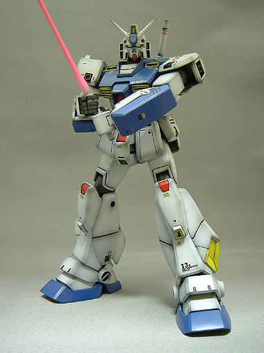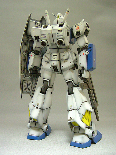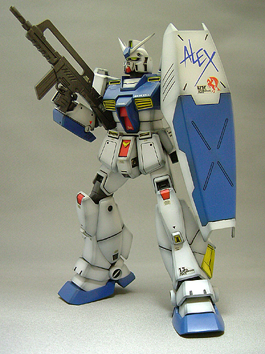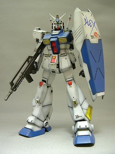 塗装なんですが、写真を見ての通りカラーリングを変更しています。アレックスはアムロ少尉専用として開発されたと解釈して、自分なりにアムロ風だとこんな感じかなと思って塗装しました。なるべく違和感の無いようにと心がけました。 肩関節カバーのラバーパーツは塗装した結果、しないほうがよかったと少し後悔してます。可動させるとポロポロ剥がれ落ちてくるようです。それとガトリングガンのスライドするパーツに塗装してしまうと可動しなくなってしまいました。クリアランスが結構シビアみたいです。せっかくのギミックが・・・('ε') 肩とシールドのパーソナルマークは以前にFGガンダム用に自作したデカールを使用してます。 2002.03.02 |