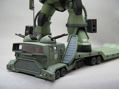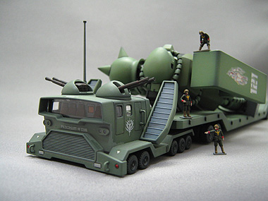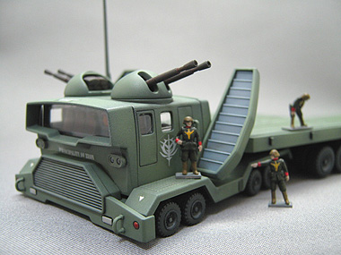 いちお同スケールのモビルスーツを載せられるようになっており おまけのジオン兵士も3体付属という、地味ですがなかなか 味のあるキットだと思います。だからと言ってお薦めはしません。