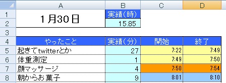 こんな感じに記録を取るんですが、便利なのは、前日のシートを、コピーして翌日に使うので、前日のやったことを見ながら追加したりしますんで、起きたら、メールチェックとかして、体重測定して、顔マッサージして、という流れができるのがいいなと。