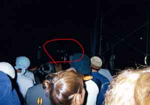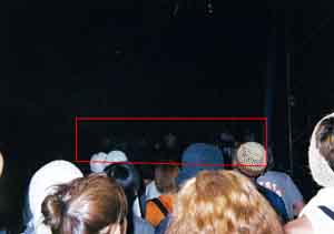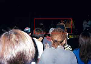 ←むっちゃ見にくいですが、赤枠内がステージ上のKENISHIIさん集団。 生でビデオカメラで撮った映像をVJスクリーンで映したり、VJもえらい良かっ たっす。 EXTRAもやって、ビデオクリップとか流れたんです。 スリーピングマッドネスもやったはずです。 テント上のミラーボールもまわってえらいきれいでした。 |