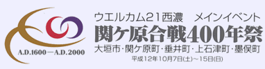 ■ウエルカム21西濃 メインイベント『 関ヶ原合戦400周年祭 』 〜歴史との出会い 東西の出会い -- 会期 -- 西暦2000年10月7日(土) 〜 15日(日) -- 会場 -- 岐阜県大垣市・上石津町・垂井町・関ヶ原町・墨俣町 関ヶ原合戦に参加した武将のゆかりの市町村等にも参加を呼び掛け、 「歴史」をふりかえると同時に、未来へ向けての「平和」と「交流」を誓うイベントを開催します。 関ヶ原合戦を400年後の現代に投影し、史実にあわせて壮大な合戦絵巻を描き出すとともに、 様々な分野の古今東西を集め、「平和の時代の東西合戦=東西交流」を大々的に展開します。