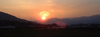 カップ麺のお陰でふたたび元気をとり戻し、歩き始めてから1時間、今度は国道170号線とぶつかる。国道170号は大坂では通称「外環」と呼ばれており、昔は東高野街道が走っていた道路だ(下図参照)。ちなみに又五郎は、地図などという洒落た物は一切持っていってなかったので、こういう見たことのある名前の道路にぶつかると、ほっとする(笑)![]() AM5時前、夜が明けた。 夜九度山を出発して、明けの太陽を本当に大坂で見れるのか?? と思っていたが、どうやらそれは達成できたようだ。 新しい朝。 もうそこは流罪の地ではなく、新たな戦いの場。 今までとは違う朝です。 さあ大坂まであと一息!