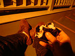 □マグライト(換え乾電池×3)□おにぎり×3、水×2 □タオル □デジカメ 換えの電池はある意味今日の生命線。山中で真っ暗闇に落とされるのだけは、避けなければ(^^; 実は最初、できたらこの水と食料だけで河内までは出よう!・・だって昔の人は、僅かな食料と水・・っても、運良く湧き水が無ければ竹筒の水だけで、かなりの行程を旅したはずだしね!・・・と思っていたのだが、とんでもお馬鹿な所業であるという事に、後で気づく(笑)。確かにこの日は夜間でもかなり暑かったが、多分今回の行程全体で飲んだ水は5リットルは越えたんじゃないかな。 加えていうと、最初におにぎりと特に水を買い込んだのは失敗。長距離歩くときは装備は軽くが原則ですね。山越え以外は、自販機も行く先々にあるだろうし、わざわざ持ち歩くと重いだけであった。 ---------