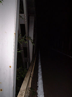 「どうやら、浅野の追っ手は見えないようだ・・・」そこは往来が激い一本道であったが、やはりここは距離を稼ぐため街道をひた歩くしかない。敵襲を警戒しながらも、迅速に通り抜けることが肝要。幸い、思ったよりも快調にとばすことができ(時速5〜6kmは出てたんじゃ?)余裕の鼻歌もまじる(^ー^町の切れ目の国道沿では、所々で怪訝な視線を浴びるけど、 「ふっ、愚かものめ。俺はこれからお主の想像をはるかに越えたところまで行くのだよ(笑)」 心の中でほくそ笑みつつ橋本で左折、道はいよいよ371号線へと入り峠へと続いていくのである。 ここまでは至って快調である。 ■PM9:30 (出発から2時間)371号線曲がって少し行ったところのローソン ■PM10:30 (出発から3時間)紀見トンネル前の歩道橋