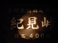 腹をくくって371号線から離れ旧国道に進路をとる。最初は民家の中を抜けていったのだが、ほどなくそれも無くなった。「おい、いきなり挫けそうだぞ(笑)」 月の光はあったので、少しは見える。しかし、暗っっっっっっっっっ!! 両側には森の木がせり出している。ここまでくると車の音も無くなって、風が木を揺らす音と、「ホロロ」何かが鳴いている音が聞こえる。「おい、こんなところで何しよんなら」たぶん、獣がそういっているのだろう。「昼は人間にゆずってやってるけど、夜は俺たちの場所だよ。知らないよ」←こう思われてるのが、一番怖い(笑)お化けもさることながら、なにか得体の知れないものが突然出てくるのが嫌だよ〜〜〜 夜の山中というのは、やはり人間があまり足を踏み入れてはいけない場所だと思った。 歩く方向に照らす懐中電灯のぼんやりとした光の輪の中だけに、夜の森が見えた。後ろは今まできた道が闇にとけてなくなっており、もう前に進むしかない・・・なにか煽られるように足取りが速まる。 もし・・・幸村が紀見峠を越えたとしたら、やはり夜であっただろう。もちろん紀見峠を越えたという確証は無い。もしかすると、和歌山までまわって海沿いに北上したのかもしれないし、それ以外かもしれない。でも旧高野街道にあたる紀見峠は、河内長野を経て大坂に至る最短ルートであることは間違いないし、考えられるルートとしては一番可能性が高いだろう。昼家臣を引き連れて堂々とというのも本で読んだが、私の中にある幸村公は、なぜか夜紀見峠を越えるのである。あくまでも罪人幸村。どこにも迷惑のかからぬよう、夜影にまぎれてひっそりと抜け出す・・・このイメージなんだよなぁ(笑)紀見峠には小さな宿場があったはず。ならばここで何がしかのドラマがあったかも知れませんね。 本当ならもう少し冷え込んだ木立と月の光に照らされながら、子、妻、家臣を連れ立ってこの峠に歩みを進める幸村。その時、彼はいったい何を感じていたのでありましょうか。 ![]() その紀見峠山頂に着いた。 さあ後は下るだけだ。・・が、下りの入り口・・・いっそう暗いっっっっっっ!上りは背中から月の光を受けていたのでなんとなく明るかったが、下りは山の反対側になるので、月の光がとどいてないぞ〜〜(笑)下り始めの部分は、まさに奈落の底に向かう感じだ。「さ、ここで夜明けを待つかな^ー^;(ひきつり半笑)」
