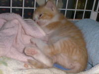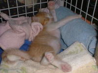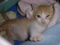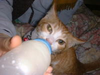 | 生後約5週間 離乳食も缶詰タイプやフツーの仔猫用缶詰、仔猫用ドライフードも食べてくれるようになりました。 ただ、まだ皿からミルクや水を水を飲んでくれないので哺乳ビンでミルクです(^^; |