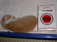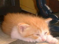 | 生後約3週間 結局、貰い手も無く、家で飼うことになった。 名前もババァ(母)の一言で「優(ゆう)」という名に決まった。 オレとしては「ゴン」とかヤンチャな名前が良かったんだが・・・。 トイレもケージに砂場を作ってやると1発で憶えた。 ただ外で遊んでると遊びに夢中で失敗することも・・・(^^; |