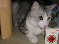 このソファベッドにいる時に、 アルミホイルを丸めたボールを投げると、 前足でキャッチしたり、打ち返したり、くわえてキャッチしたり・・・という遊びが好きです。 キャッチして「また投げろ」と運んでくる姿はまるで「犬」!(爆) |