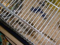 写真には写ってませんが、 この右側に水入れがあります。 最近はケージは「留守番用」でケージの外にいる事が多いです。 |