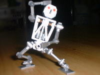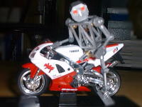 んで、このキット。 雑誌の付録よろしくグレー成型+ポリキャップのお手軽キット。 2ちゃんの模型板のスレではオプションのドリルアームを回転させたり、目を発光させる等の改造が話題でした。 オレはカンタンに成型時のヒケや手足の穴をパテ埋め全体を明暗をつけた何種類かのシルバーで筆塗り。 目を蛍光レッド、腹の中の機械(?)の一部をゴールドとカッパ−で塗り、中央の2つ並ぶ円柱状の部品と足首にアルミテープを巻いてあります。 キャノン発射時の「コマネチ・ポーズ」(爆)が出来るように良く動くキットです。 |