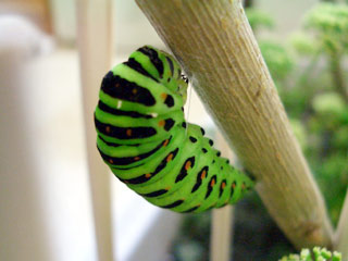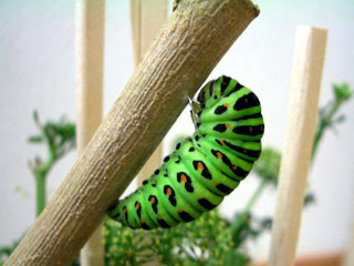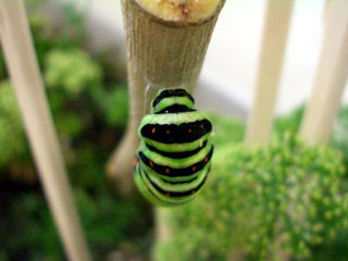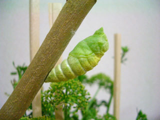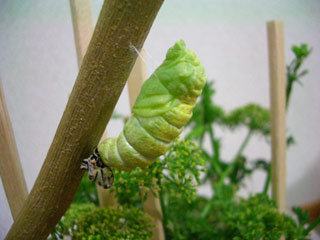 6月25日 17:12 こちらはチョコちゃんの様子。 チョコちゃんもミント君から少し遅れてさなぎになる準備をしてましたん〜 どっちも観察できないんで写真はミント君ばっかやけどね。 チョコちゃんは木の枝はお気に召さなかったようで、頼りないパセリの茎にひっついてるわ。 すごいな、、これもな、、 ええんかよ、、って気もするよなぁ。。。 |