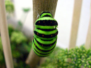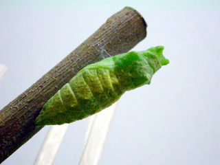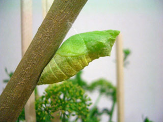 6月25日 20:40 ミント君の姿〜 なんだか凛々しい(⌒▽⌒) あのぷわぷわな派手な色の幼虫から蛹になって、嬉しいけどなんとなく寂しいような・・・ むしゃむしゃパセリを食べてた姿が懐かしいわ。。。 この綺麗な緑色も明日の朝になったら茶色くなってるやろな〜 それからちょうちょになるまで・・・ あとどれぐらいかかるかな。。。 頑張れ、ミント君(⌒▽⌒)ノ |