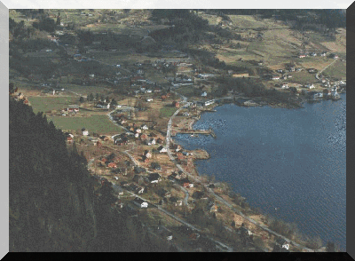 100戸ぐらいのフィヨルドの谷筋にできた小さな町で、緑豊かな、落ち着いた田園風景がひろがつていた.道路で子供が4−5人遊んでいたが、時刻のせいでもあろうか、人通りもないし、車もみなかつた.