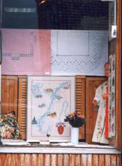 Bergen Embroidery ShopThere was an embroidery shop in front of the station in the Floibanen mountain railway.This shop was considerably abundant also in numbers of goods.Bergen Embroidery Shop ベルゲン刺繍店 Floibanen登山鉄道の駅の前にあつた刺繍店、かなり品数も豊富で、店のショウインドに見事なノルウェ−の国をあしらつたクロスステツチ刺繍が、かざつてあつた. |