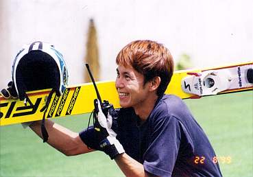 1999.8.22 しゅりさん撮影 トランシーバーでコーチとお話し。 笑顔でお話しをしているところを見ると、 このジャンプは良かったのかな? |