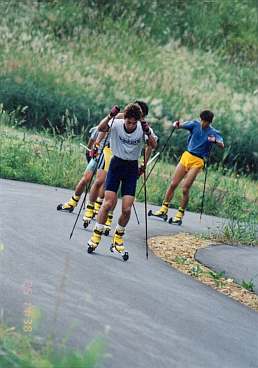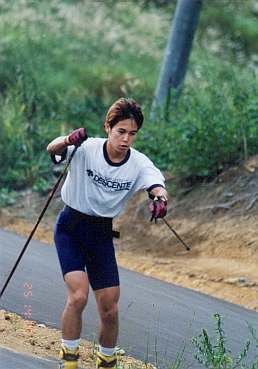 午後の練習は木島平村のローラースキーコースで行われた。 野沢温泉を14:30出発ということだったので、練習の開始は 15:00頃だったのではないかと思う。 木島平のコースはとても見学がしやすく、私の見学したポイントからは 選手が周回するのが何度も見ることができた。 この日は練習ということもあり、最初は他の選手と話しを したりしながらスローペースで滑っていたが、やはり徐々に スピードを上げ、最終的にはかなりのスピードになっていたように感じた。 やはりローラースキーはとても楽しい。 冬のクロスカントリーと同じような迫力を感じてしまうのは私だけだろうか。 |