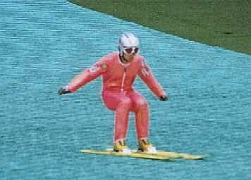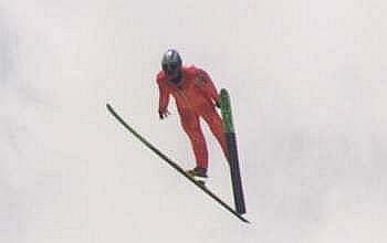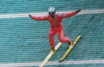 ラージヒルを飛ぶ森選手。スタンド中段より撮影 |