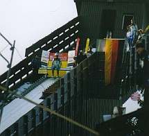 大会当日。 前日、雪が降らなかったので、周囲の木々や森はすっかり緑色でしたが、(去年は真っ白だったんですよー) とても良いお天気でした。 オープニングでは少年ジャンパー3人のジャンプのあと、各国の国旗を持った青年達がカンテの下あたりから滑り降りてきて、その時に場内にはそれぞれの国の言葉で歓迎の言葉が放送されたのです。 ちょっとドイツ語なまりな日本語で「ニホンノミナサマ、ヨウコソオコシクダサイマシタ…」 なんだか嬉しくなりました。 |