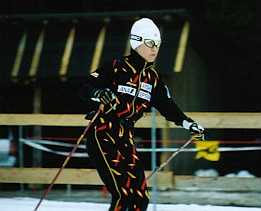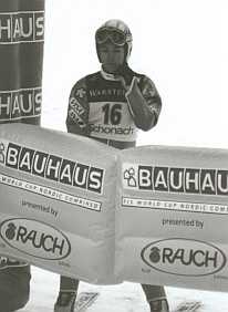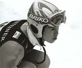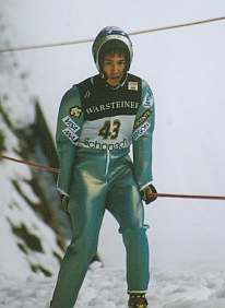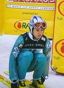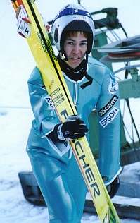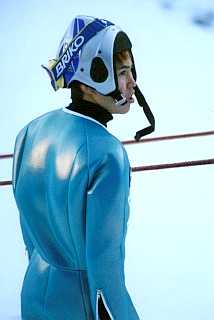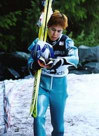 そして、競技開始… 43番で森さんのジャンプでした。 前日のトレーニングよりも、観客のひしめき合っている会場で、私達は、当日、ジャッジタワーの真下で観戦しました。 そこは、カンテを踏みきった選手が、パーンと飛び出してすぐの瞬間が見えるような所… この眼で見るには、とても迫力があってとにかくすごいんですが、カメラ越しに見ると…だめですね〜。慣れないスピード撮影は… そして残念な事に、あの角度からは、着地の瞬間がいまいちよく見えませんでした。 でも、迫力十分… ジャンプの結果は森さん8位だったようです。 |