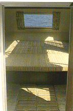 上段ベッドは3枚のマットからなり、そのうち1枚は普段奥に押し込んでいますが,就寝時は引き出して,長さ2mとゆったりサイズになります。両側と進行方向には窓があり、ルーフベンチレータもあって、閉息感はありません。