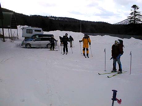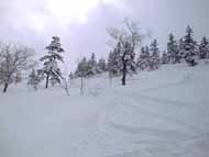 避難小屋に到着後、遅めの昼食。この頃から徐々に空も明るくなり、雲底も上昇し始めた。まあマーフィーの法則じゃないけど、これが山の常。気を取り直して昼食後は、今までの鬱憤を晴らすべく、昔スキー場であった斜面を望岳台めがけ一気に滑るが、もうちょっと斜度が欲しい!。これにて下山終了。振り返るとうーん、稜線近くまでばっちり見える!。