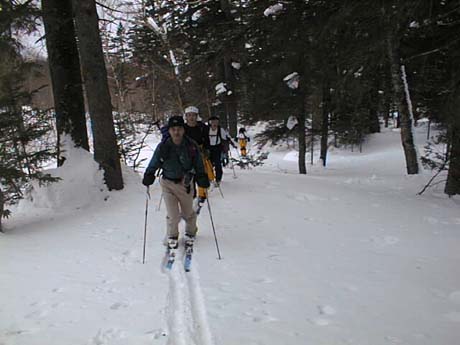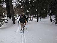 さて待望の下りだが、昨日・一昨日の+10度を越える暖気が今日の冷え込みでガリガリだけならいざ知らず、今朝降ったばかりの新雪が深かったり浅かったりと一定していないため、つんのめったり暴走したりと落ち着きない。そんな悪条件のため、極楽疎林斜面を堪能したとは言えなかったが、そんな場所でも全くペースや滑りが変わらずに滑るのがベテラン山屋のADACHIさん。またN川さんも小回りで颯爽と降りていく。今日の山スキーヤーはレベルが高い!。