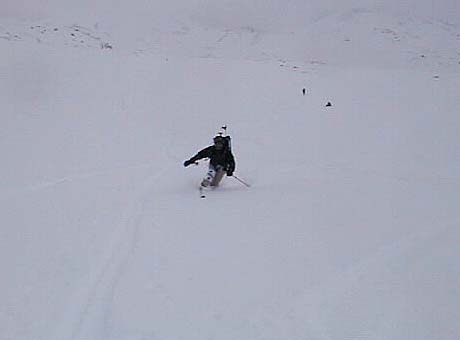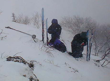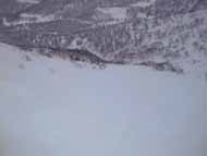 上部は、視界は利かないは、尾根はガリガリだは、あちこち岩だらけだはで、ただ降りただけ。グランドからの下りでようやく滑降モード開始。気温が低いので表面の雪質はパウダーだが、その下がモナカ状なので、エッジが引っかかり易く、おまけにあちこちに岩が出ているため、なかなか気は抜けない。大型三脚を背負ってザックのバランスが悪くなったテレマーカーO西氏も苦労している。放送用カメラを背負った放送局員に至っては下手に転べないので、ひたすらプルークあるのみ。ご苦労さまです。