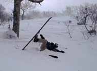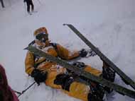 今回だけは珍しく少数派のテレマーカーである三段山クラブ員、山スキーヤーに負けじと応戦する。ただ今日の、いきなり急制動が掛かる安定しない雪質には、ヒールが固定出来ない彼らは苦労したようだ(カンダハーみたいに、板のサイドにワイヤー引っかけるフック付けては?)。転倒シーンばかりアップしたけど悪気はないんですよ!悪気は。だって下でカメラ構えて待っていると、皆さん目の前でポーズ取ってくれるんだもん!。