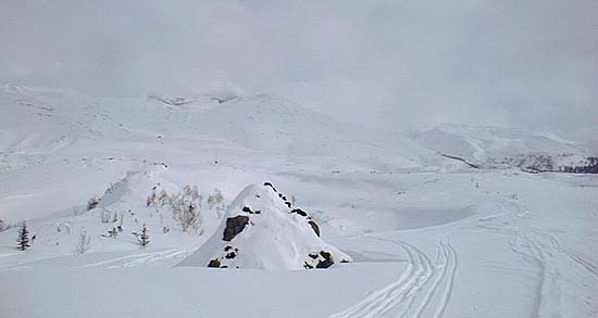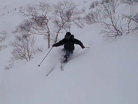 放送用の撮影としては失敗でしたけど、私は久々の冬山らしさを味わえたし、この時期としては軽い粉雪も滑れたしと、そこそこ楽しめて満足。この夜はO西氏の自宅に泊めて貰い、一晩中彼のコレクションの過激スキービデオ(アダルトじゃーないよ!)を見せて貰ってお目目が点!。うーん、前書いたコラム