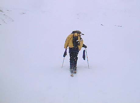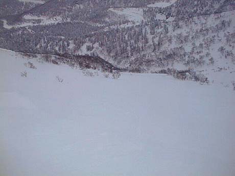その中でもさすがベテランH江氏は安定した滑り。MLのADACHIさんといい今回のH江氏といい、生粋の山屋の老獪な滑りの真価は悪条件下でこそ発揮されるようだ。老獪さでは負けるものの、ブーツの性能で勝る私は、必殺高速後傾テール滑りで対抗するが、クラスト層の上の新雪が風で薄い区間では、いきなりスキーが前に滑りだして転けそうになるのが玉に瑕。