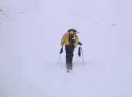 山頂直下になって、いきなり天候が吹雪模様になり、風も強まる。山頂で乾杯や腹ごしらえする雰囲気ではなく、そそくさと下山の準備にかかる。こういう時には、保守的な取り付けシールは気を使わずに済む。