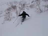 さすがに朝一番ほど雪は軽くないものの、新雪のおかげで昨日嫌らしかったモナカ層がかなり下になったため、昨日・先週・先々週の鬱憤を晴らすべく、疎林の粉雪の大斜面をぶっ飛ばしたらスカッとした。