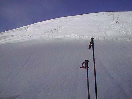 ラッキーな事にこの先、昨日のラッセル跡が残っていたので、ちゃっかり使わせて貰う。すねまでのラッセル深で、この時期の十勝としては浅いが、雪質は昨日からまた10cmほどふかふかのパウダーが積もったようで、コンディションはまずまず。 しかし太めのカービング板&細目の取り付けシールの組み合わせは最悪。ちょっとした登りのラッセル跡を直登出来ず、半分以上自前でラッセルさせられる羽目に合う。でもこの極楽尾根を帰りに滑れることを考えれば、大した苦ではない。