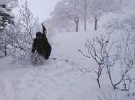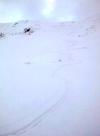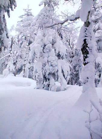 そうこうしている内に森林限界に。風もちょっと出てきたのに加え、遂にガスでホワイトアウト。さらに適当に登るが、森林限界を越えると全く目標物がないため、地形がまるで判断できない。さすがにホコ岩(1700m)まで行くはあきらめ、1500〜1600m地点にて折り返す。 尾根上はシュカブラがうるさく、第一ホワイトアウトでどこが尾根だか地形がわからない。で、尾根東側の沢の源頭斜面へ。雪庇の下でいつもの儀式、スコップを取り出しハンドテスト。結構な斜度&新雪はあるが雪は安定していた。
