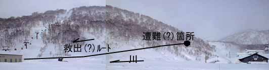 しかしてそこには、半ば放心状態でぽつんと雪の上に座っている20歳前後のオネーチャンが一人。”怖かった!私ここで死ぬんだなーってずっと考えていたー!。もうボードなんて絶対しない!”と半べそ状態。旅館が対岸に見えるのに、”なんてオーバーな!” 取りあえず落ち着いた所で事情を聞くと、”スキーのトレースがあったのでー、跡付いて行ったけどー、途中で付いていけなくなったしー、進まなくなったのでー、ここまで歩いて降りてきたけどー、もう歩けなくなったー”との事。にわかバックカントリースノーボーダーだったらお灸をすえにゃーいかんかと思ったけど、コース境界のロープは雪に埋もれて見えなかったそうな。 取りあえず川までは若干標高差があるので、スキーで緩い下りのトレースを付けてストックを彼女に貸すと、なんとか漕ぎ漕ぎ進めて、スキー場まで残り1/3地点まで到着。ここからは全く平坦なので、今度はジルブレッタのヒールを開放し、行ったり来たりの返し縫い歩行で道作り。彼女にそこを歩かせて、スキー場手前でようやく到着したパトロールに後を引き継いでようやくお役御免。