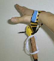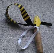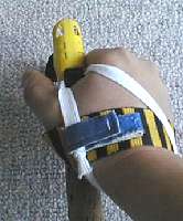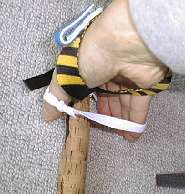 最初にゴム紐を、ストラップの付け根下のグリップに縛り付け、あともう一つ輪を作ります。この輪の大きさが小さいと手首が鬱血し、大きすぎると効果がないので、後で調節できるようにしておくと良いでしょう。仕掛けはただこれだけです。