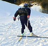 クラシカル用スキーのアーチベンド部は、普通両足に均等に体重を掛けていると接地していません。但し、スキーを後ろに強くキックする際には、アーチベンド部も荷重を受けて雪面に接地し、グリップして前に進みます。キックした後は両足荷重になるのでグリップゾーンは雪面から浮き、抵抗無く滑るわけです。スキーが短いとグリップゾーンが接地しやすく抵抗が大きいので,身長+30cm位の長さがいいかな?。体重がある人はもっと長めの板にしましょう。とは言ってもあまり長すぎると登坂時にテールが邪魔になりますけど。