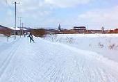 丸瀬布市街を過ぎ,遠軽に向かってのコースも相変わらず快調。今年もウフフ!なタイム出るかなあと甘い期待をしていたが、遠軽に近ずくに従いコースが柔くなり,板がだんだん潜るようになる。おまけに今まで味方してくれた風向きがやや向かい風となり、ペースが徐々に落ちてしまう。バリバリのレーシングポールで、申し訳程度のバスケットしか付いていない人は潜って大変そうだった。