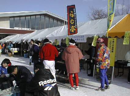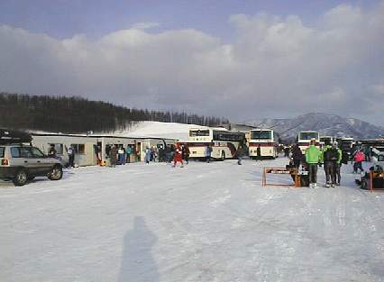 朝5時半頃起床。気温は思ったほど冷え込まず、外気は-10度ちょっと。送迎バスの出る7時まで悠然と、お定まりの力うどんを食べ、紅茶をがぶのみして水分&カフェイン補給。これってドーピングになるのかなあ。大会で用意したデラックスバスにて、スタート地点の日野自動車テストコースへ向かう。ここで受付も済ます。着替え等の荷物も、大会の用意したトラックに預け、ゴールまで運んで貰う。