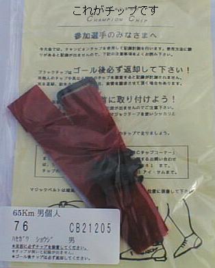タイム計測はチップと呼ばれる、わずか数グラム程度の小さなプラスティックを、足首にマジックテープで固定して行います。こんなもので自動計測が出来るのですから時代は進化したものですね。