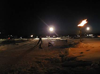 ゴールから約10kmほど手前から、暗くなると所々松明が灯り,その中をゴールすると感動ものだそうです。十分早いのにわざわざ遠軽で、薄暗くなるまで時間つぶしをする人がいるとかいないとか。