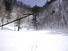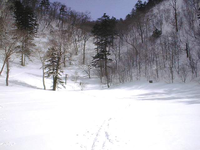 展望台の手前より、ご覧の沢状地形を湖に向かって降ります。クロカンにとっては結構な斜度&濃いブッシュがありますので、ご注意下さい。まあいざとなれば、板を脱いで歩く覚悟があればなんとかなる標高差です。