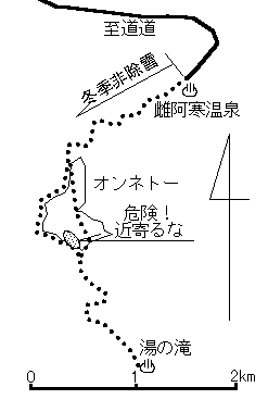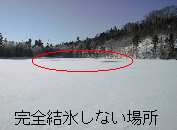 但し図で示した部分は温泉熱のせいなのか川の流れのせいなのか、真冬でも完全氷結しませんので、近づかないように注意しましょう。