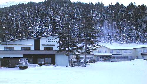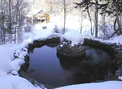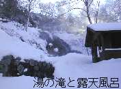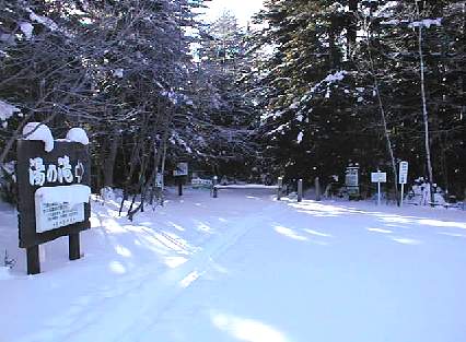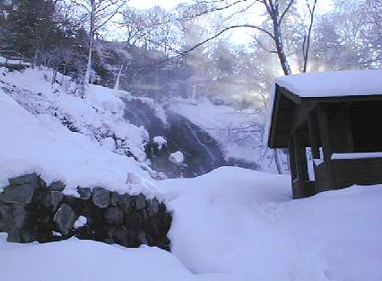 2km弱歩いて程なく湯の滝着。ここの池には熱帯魚のテラピアが群をなして泳いでまして、驚かされます。ここからはスキーを脱いで露天風呂へ。