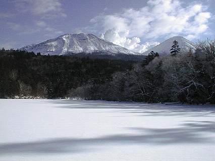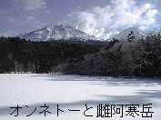 今時入浴料がたったの200円!の野中温泉に車を停めて、冬季閉鎖の緩い下りの車道を進みます。やがて眼前には、白煙を上げている雌阿寒岳をバックに、白い平原のオンネトーが広がります。