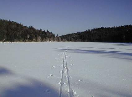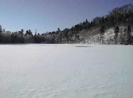 湯の滝方面へはこのまま車道を歩いていっても着きますが、厳冬期で氷がしっかりしていれば、氷結したオンネトーを直線に横断した方が、距離も2/3に短縮出来ますし、なにせ眺めも最高です。