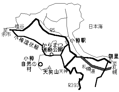 札幌からですと、小樽駅手前で天狗山方向へ左折して小樽環状線沿いに進み、天狗山スキー場を過ぎたあたりで、”天狗山観光道路”へ曲がります。そして山頂から2km手前に”おたる自然の村”があります。